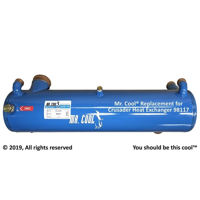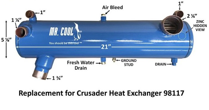 Offered is a replacement for 98117 Crusader Heat Exchanger. This part is guaranteed for fit and function and carries a two year warranty. 98117 and 98178 both have the same configuration and are both made with a copper bundle. If you would prefer a Copper Nickel version, please call and we can provide that part for you as well. This rear mounted heat exchanger mounts over the transmission. Bolt on end caps are used to allow you to clean out the seawater section.