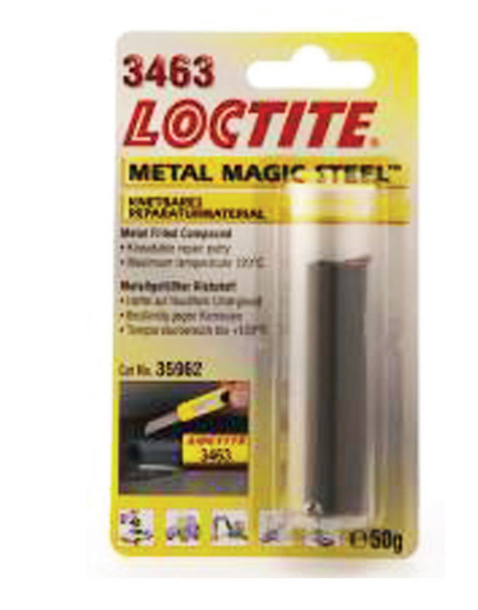 LOCTITE® 3463 is a versatile, dual component, steel-f lled epoxy repair putty. It is applied like a putty and when cured it exhibits high compressive strength and good adhesion to most surfaces. This product stops leaks in pipes and tanks, and repairs small defects in housings and machined inlet holes of welds and bolt, motor block, etc. This product is typically used in applications with an operating temperature range of -30 °C to +121 °C.