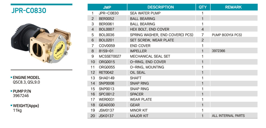 #JPR-C0830 JMP Marine Cummins Replacement Engine Cooling Raw Water Pump