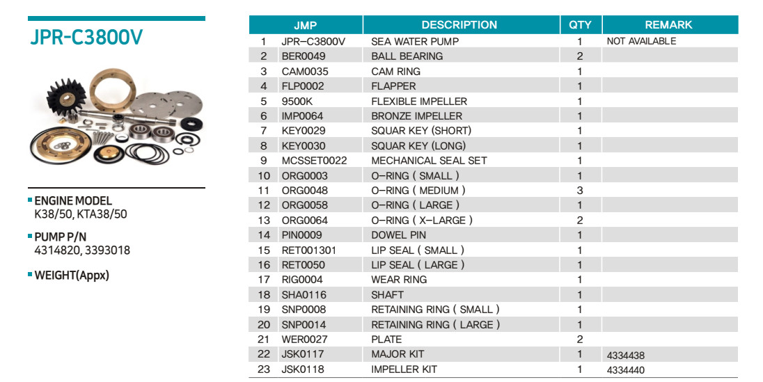 Mô tả:PR-C3800V Seawater Pump JPR-C3800V Seawater Pump Reviews (0) Brand: JMP Corporation Description Cummins Replacement Pump **Parts Only** Impeller: IMP0064 (Bronze) and 9500-01 (Flexible Rubber) Engine models: Cummins K38 / K50 / KTA38 / KTA50 Cross reference no.: Cummins 4314820 / 3393018 / 4314522 Jabsco 15780-0000 / 15780-0100 JMP JPR-Vortex *Sold Separately* Repair Kit: Bronze Impeller – JSK0118 Major – JSK0117 **Requires JSK0118 and JSK0117 for a complete repair**