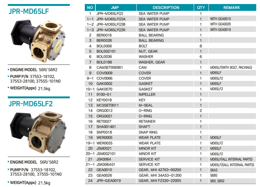 JPR-MD65LF2 Seawater Pump JPR-MD65LF2 Seawater Pump JPR-MD65LF2 Seawater Pump Reviews (0) Brand: JMP Corporation Description Mitsubishi Replacement NEW MODEL *Cam is inbuild to impeller housing* Port Size: 2 ½" / Flange Impeller: 9100-01 Dimension (L x W x H,mm): 295 x 213 x 186 Weight (Approx): 20.5 Kg Engine models: S6B, S6A, S6R, S6R2 Cross reference no.: Mitsubishi: 3755-101N0 / 42783-20300 *Sold Separately* Repair Kit: Major – JSK006401 Minor – JSK002101 Gear: GEA0010 (S6A3) GEA0019 (S6R / S6R2) GEA0026 (S6B5)